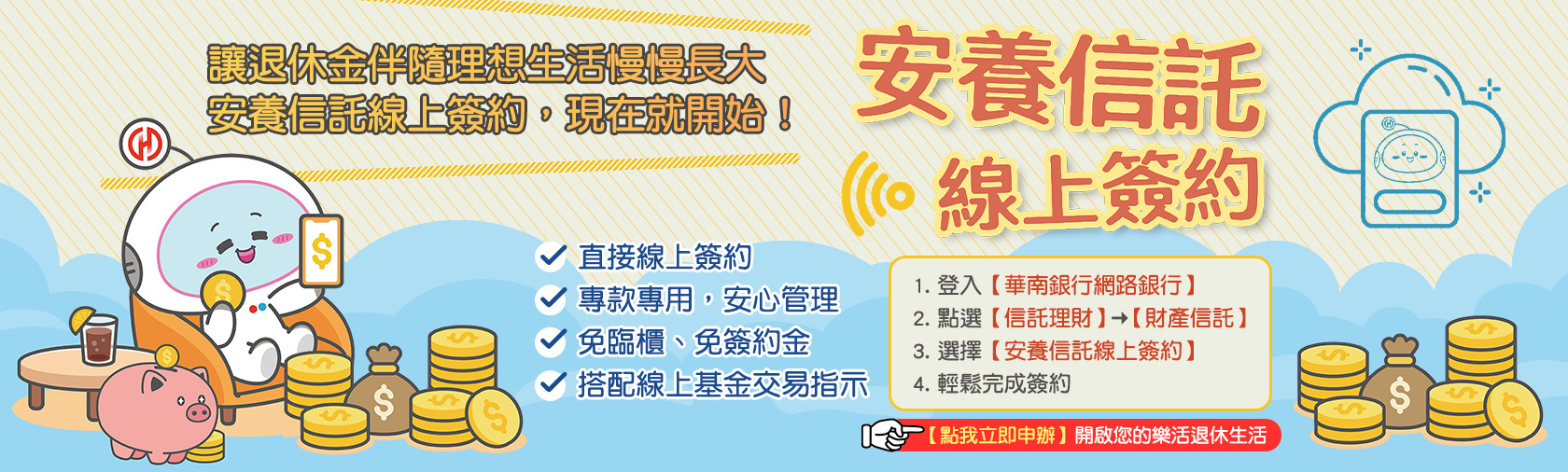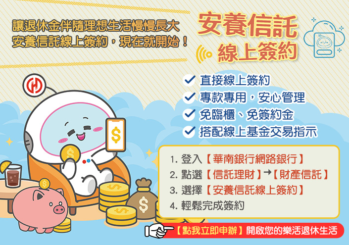 協助有需求之高齡者,提早透過華南銀行全方位規劃,活化並管理財產,以享有美滿人生
